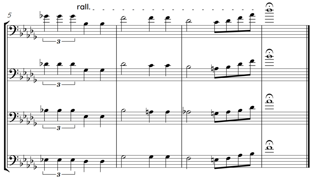 Towards the end of the soli, from bar 65-66, the 1st and 3rd trombone are in unison as well as the 2nd and 4th bone, apart from them being an octave apart. The unison helps it to feel like a really triumphant moment in the piece.