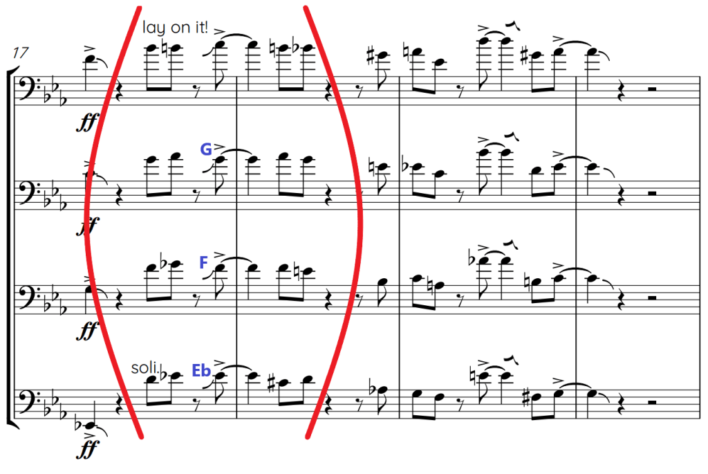 My favourite bit from this soli is from the climax after the first 16 bars. All the trombones leap into the high register with this tasty, laid-back phrase. The lead trombone goes chromatically up and down in these first 2 bars, where you would expect the other trombone parts to do the same. However, we have the 2nd and 3rd bone going back down to their first note and the 4th bone staying on their Eb. The slight variety of intervals makes each part stand on its own.