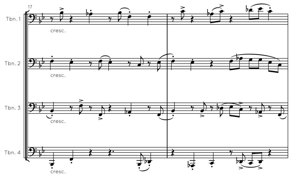 The first statement from the bass trombone outlines the key very clearly by playing the root and fifth on the first two downbeats of the piece. This helps the other trombones when they enter as just these 2 notes help provide a sense of pulse for them to follow.
