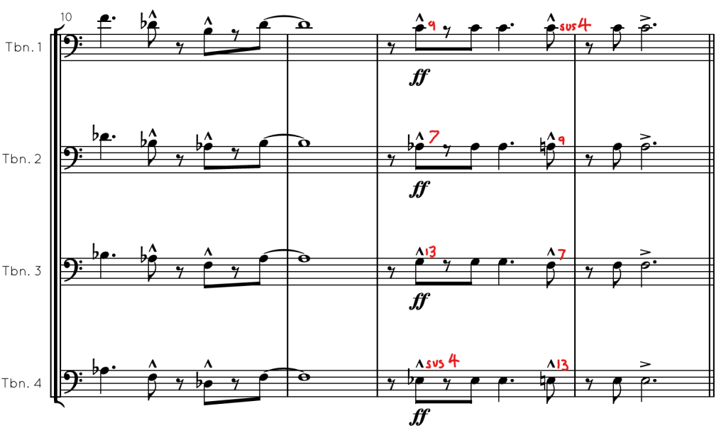 You also see these Dbmaj7(add6) chords throughout this piece in the trombones, with the Ab, Bb, and C voiced closely together however it doesn’t sound muddy.