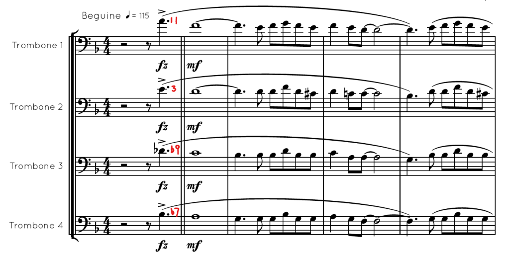 No independent rhythms here, this is a fantastic example of block voicing. The trombone are written in that golden spot where the chords sound thick and rich but not muddy. There is also always at least a third between the 1st and 2nd trombone, with tighter intervals lower in the section.